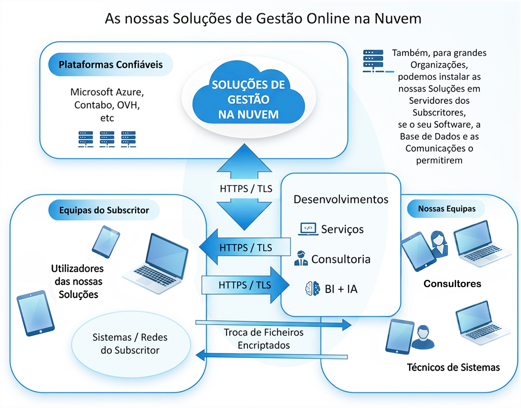 - Como se vê na imagem acima as nossas Soluções de Gestão a usar estão disponíveis em plataformas confiáveis na nuvem a que damos acesso seguro (HTTPS / TLS) aos nossos Subscritores.
