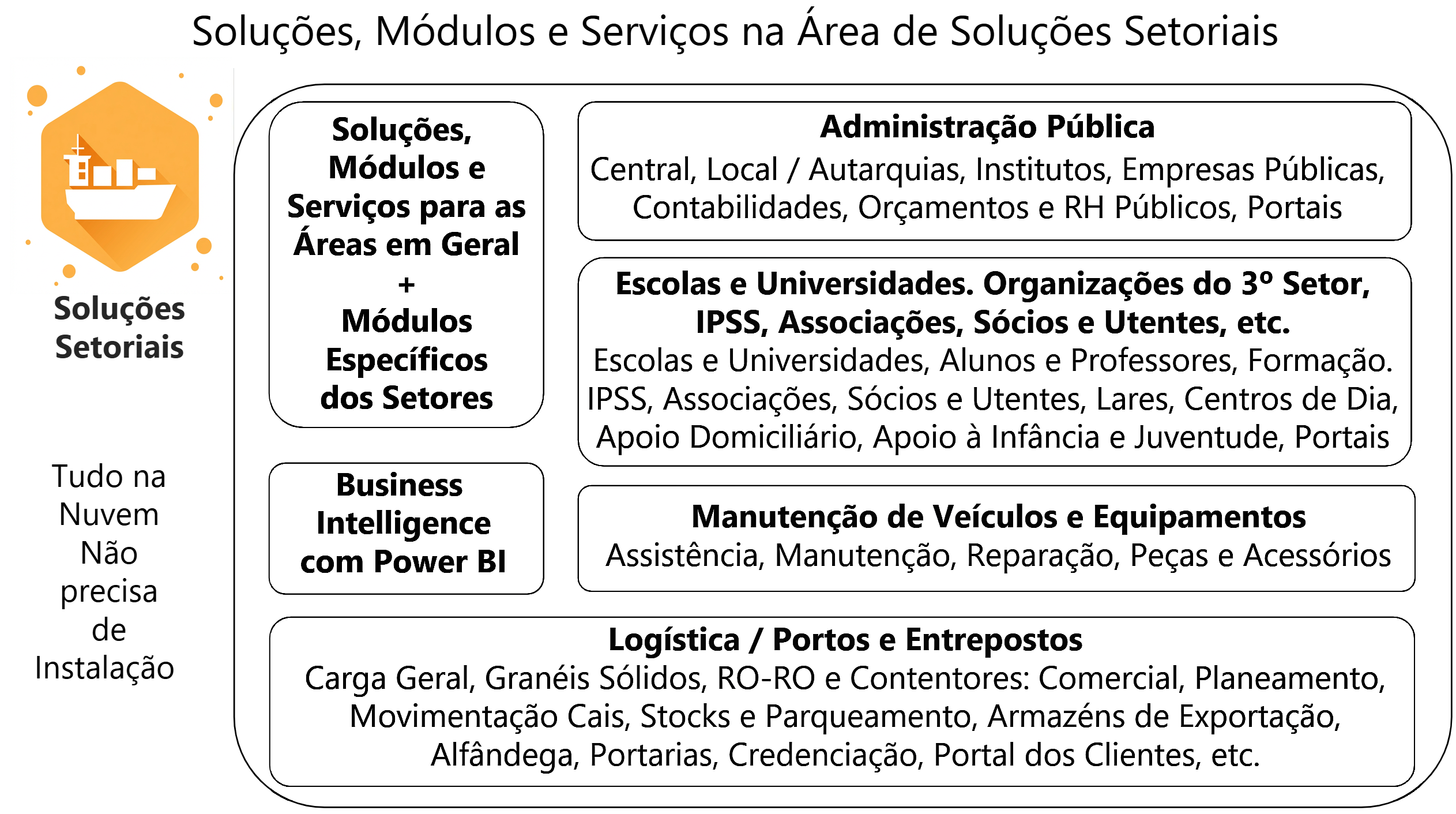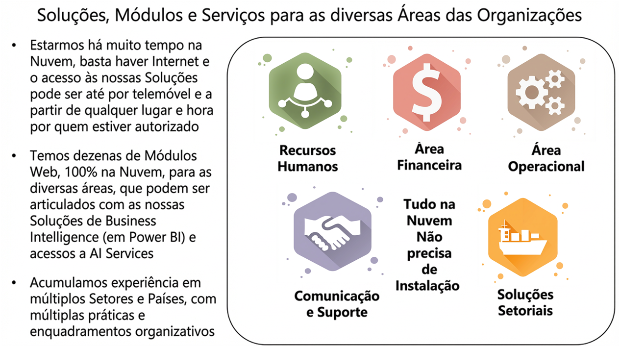 Por exemplo, numa Solução para Portos, para além dos Módulos Setoriais específicos dos Portos, a Contabilidade, Tesouraria, Recursos Humanos e muitas outras áreas usarão os respetivos Módulos Universais.
