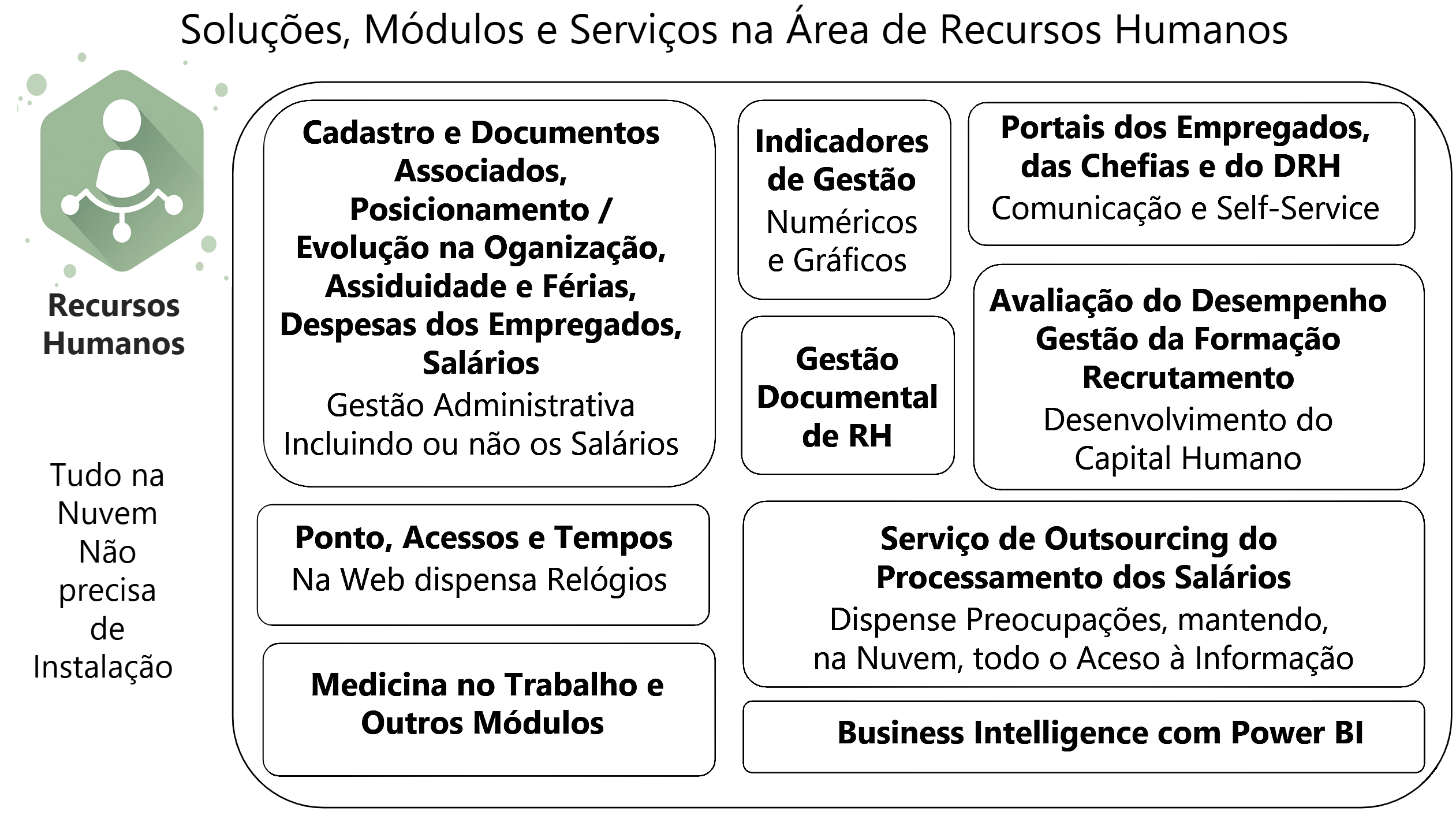 - Pack P400 para a Gestão Administrativa de RH, exceto Salários, incluindo Cadastro, Assiduidade, Férias, Indicadores de RH, Portais do Empregado, das Chefias e do Departamento de RH (Ver)