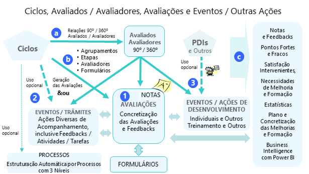 Com base nestes elementos são geradas todas as Ações previstas para o Ciclo, em particular as Avaliações, Feedbacks e Eventos / Trâmites e Ações Diversas de Acompanhamento.